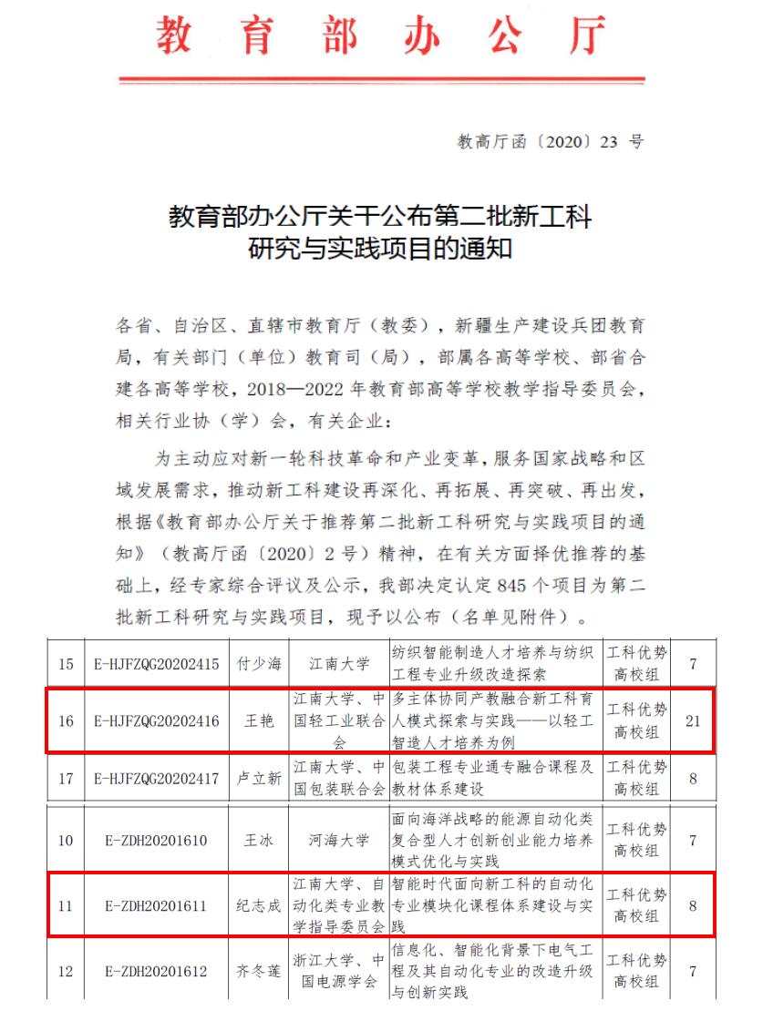 2020年教育部“新工科”研究与实践项目2项:多主体协同产教融合新工科育人模式探索与实践-以轻工制造人才培养为例、智能时代面向新工科的自动化专业模块化课程体系建设与实践