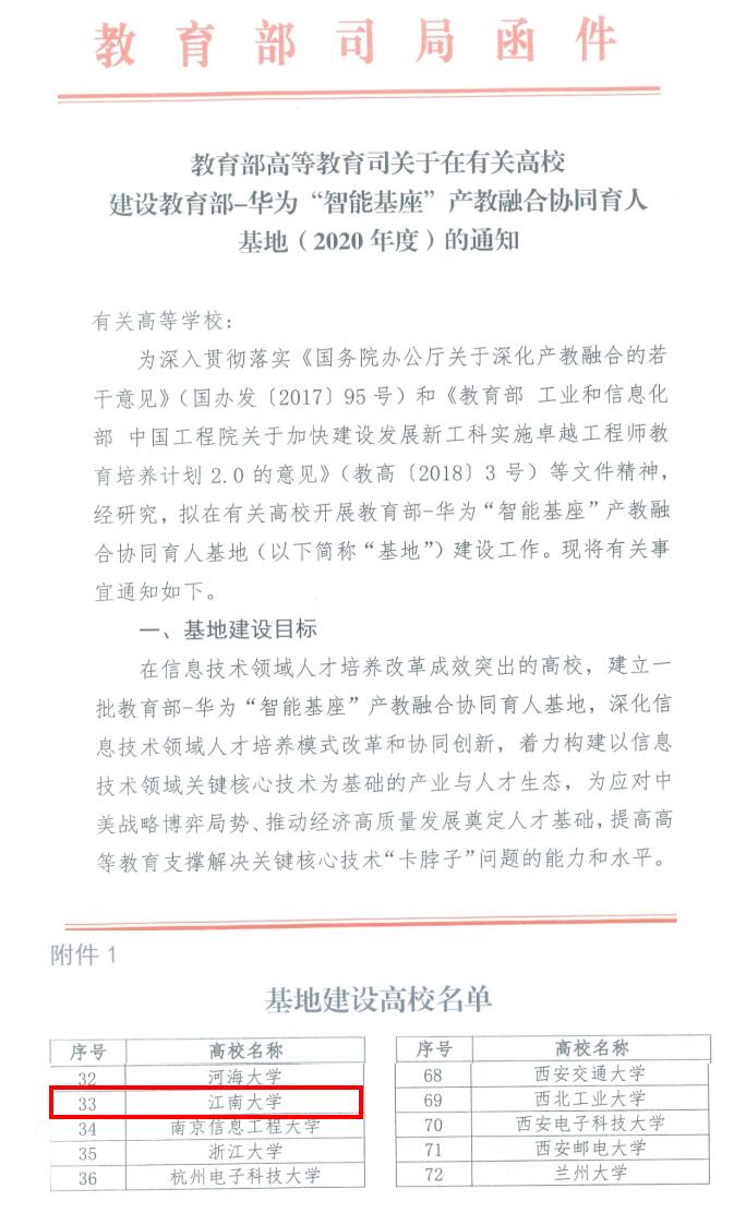2020年教育部教改项目1项:江南大学-华为“智能基座”产教融合协同育人基地