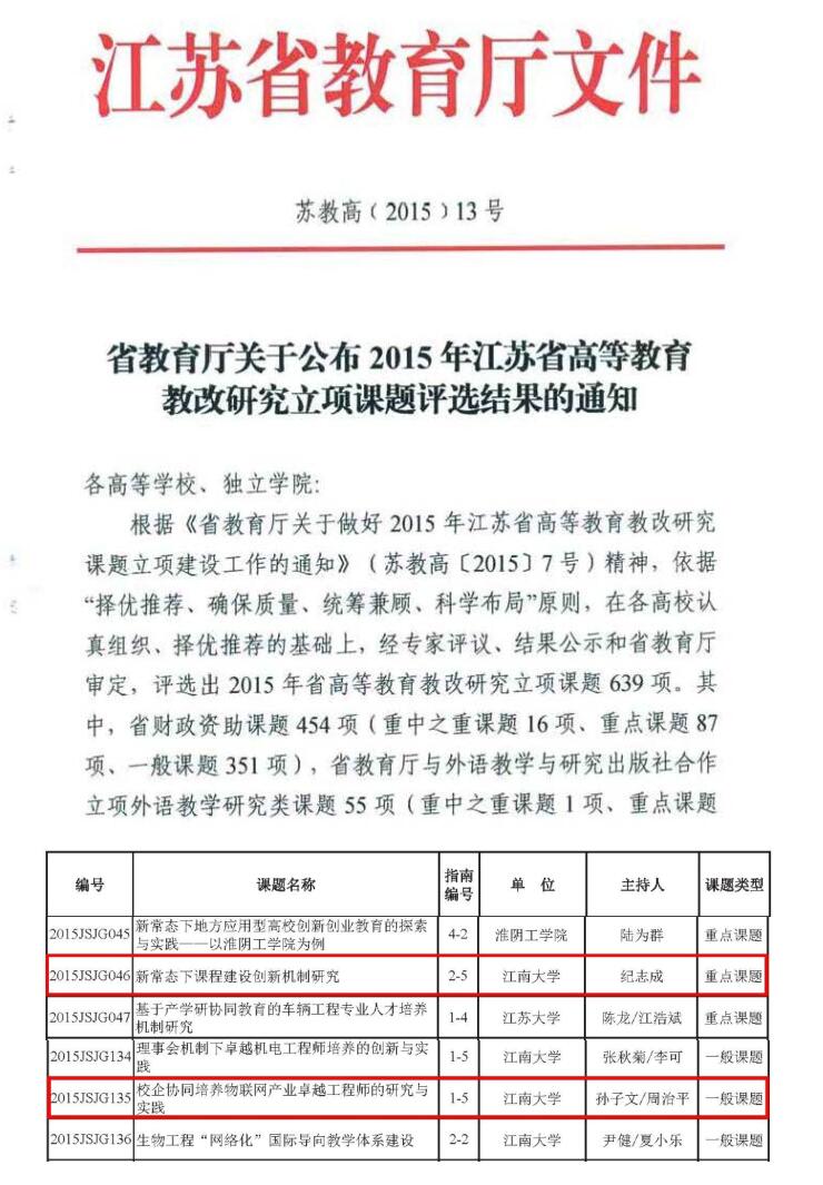 2015年江苏省高等教育教改研究课题2项:校企协同培养物联网产业卓越工程师的研究与实践、新常态下课程建设创新机制研究(重点项目)