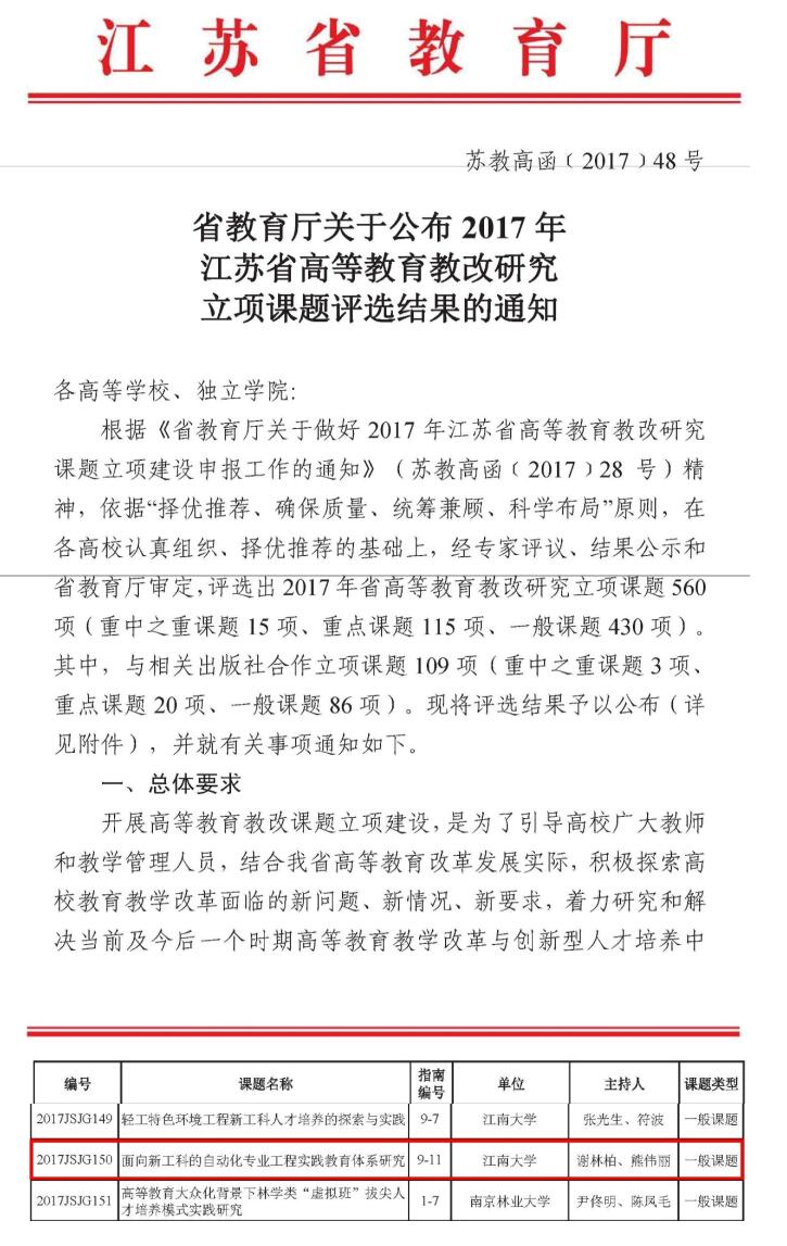 2017年江苏省高等教育教改研究课题1项:面向新工科的自动化专业工程实践教学体系研究