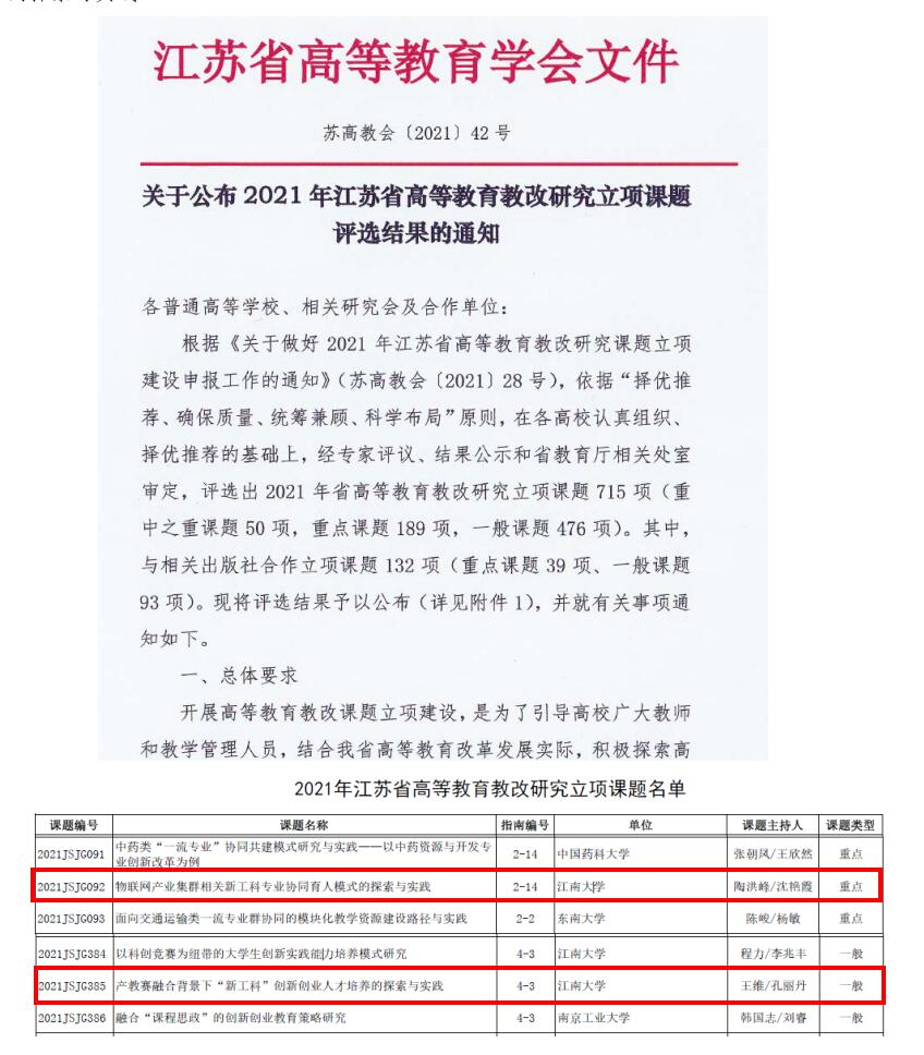2021年江苏省高等教育教改研究课题2项:物联网产业集群相关新工科专业协同育人模式的探索与实践(重点项目)、产教赛融合背景下“新工科”创新创业人才培养的探索与实践