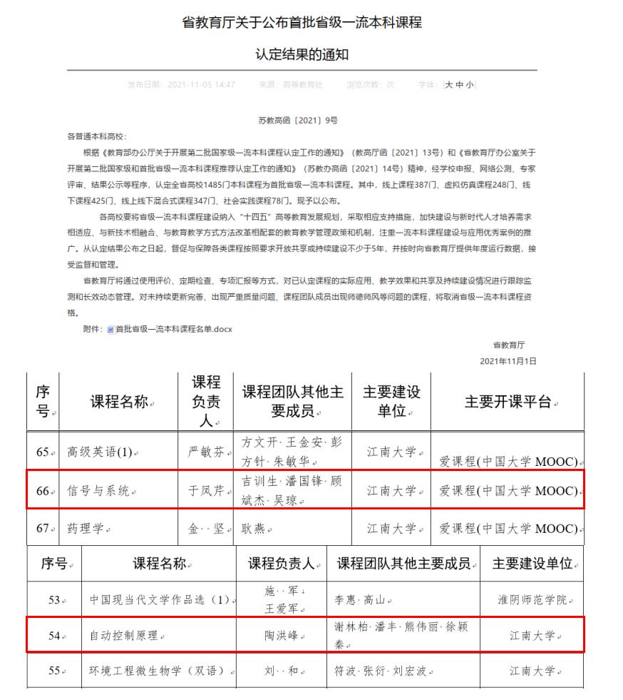 2021年江苏省一流本科课程2门:自动控制原理、信号与系统