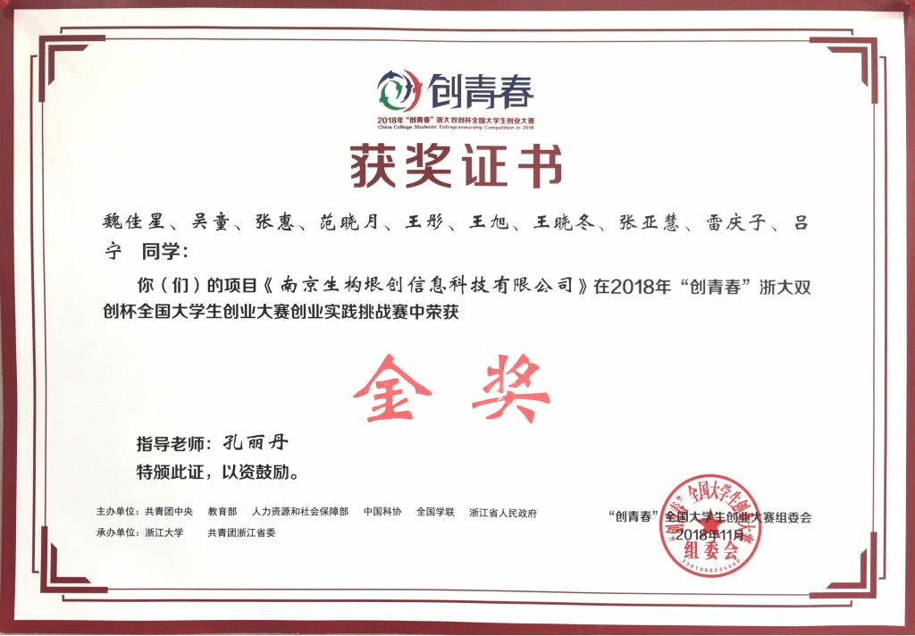 2018年“创青春”全国大学生创业大赛金奖1项:南京生构垠创信息科技有限公司