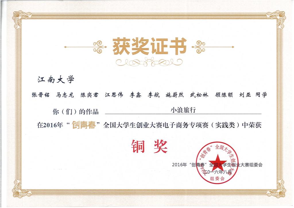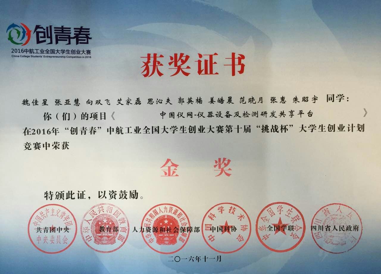 2016年“创青春”全国大学生创业大赛金奖1项:中国仪网——仪器设备及检测研发共享平台;铜奖1项:小浪旅行